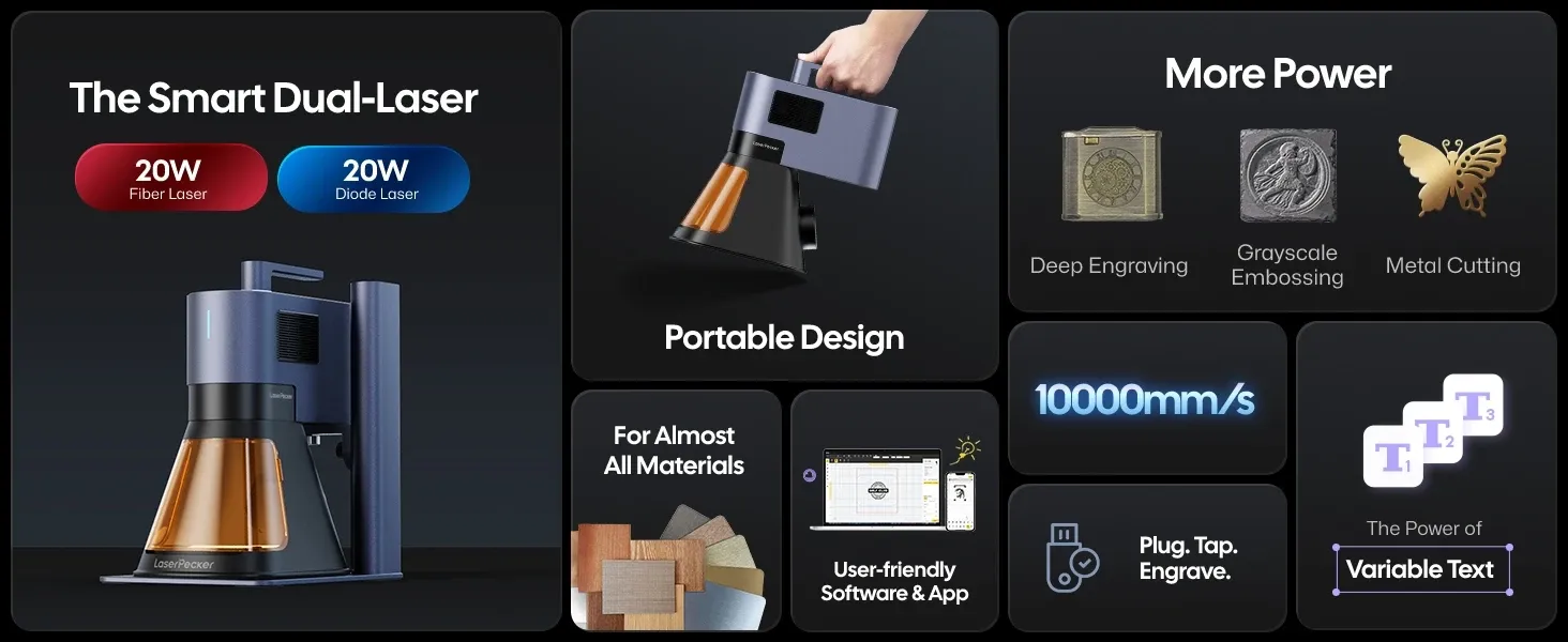 A premium portable laser engraver designed for UK makers who need one machine for stainless steel, titanium, wood, leather and acrylic. The LaserPecker LP5 combines dual 20W fibre and diode performance with compact desktop practicality for profitable custom work and batch-ready production.